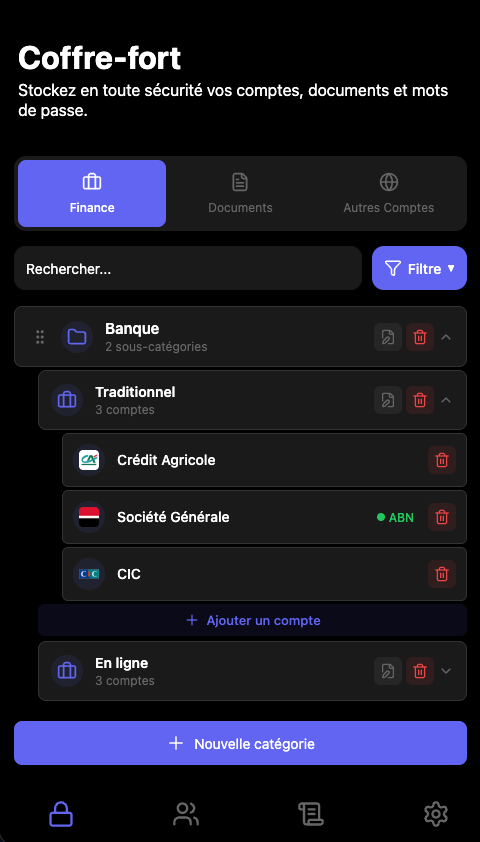 Stockez vos documents officiels, mots de passe, comptes bancaires, contrats, investissements et bien plus. Tout est organisé, chiffré et accessible uniquement par vous.